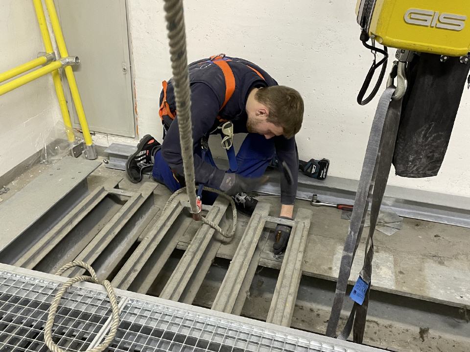 Der neue Schlauchaufzug wird auf die bereits montierte Unterkonstruktion mit den Edelstahl-Schlauchbahnen montiert.