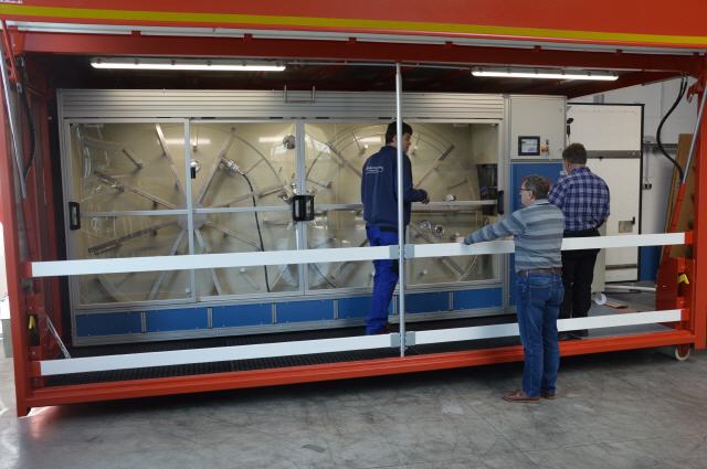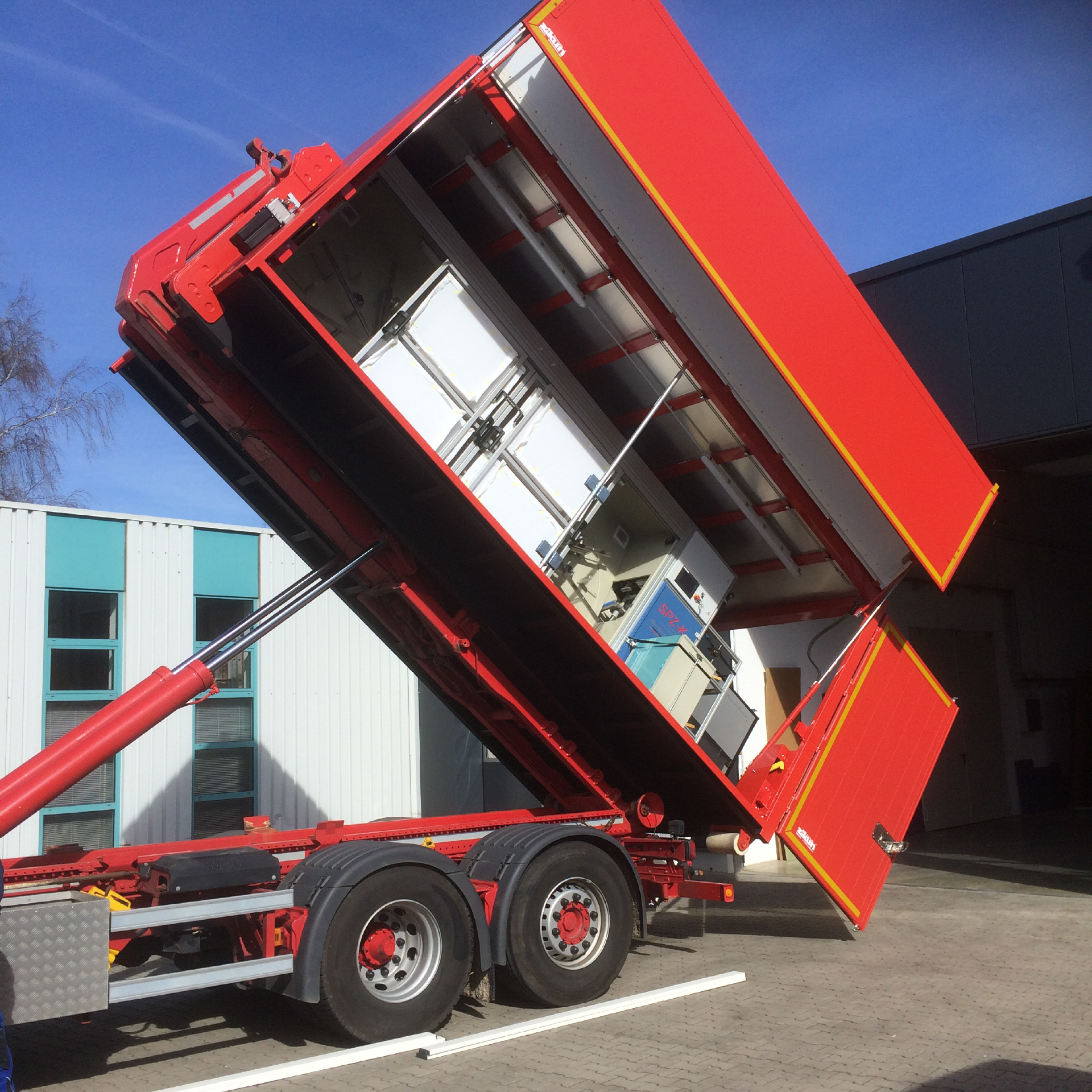 Vor der offiziellen Abnahme durch die US-Army in unserem Unternehmen wurde die komplette Anlage mit Container einem "Stresstest unterzogen" Neben dem üblichen Funktionstest wurde die Anlage auf die extremen Belastungen beim Verladen sowie im Straßenverkehr getestet. Es wurden extreme Kurvenfahrten, Bremstests und Fahrten in unebenem Gelände durchgeführt. Besondere Belastungen kamen während der 30 Minuten Schrägstellung auf die gesamte Anlage zu. Während der Schrägstellung auf dem Containerfahrzeug wurden sämtliche Antriebe einem Funktionstest unterzogen. Auf Grund der sehr guten Qualität der Materialien und Zuverlässigkeit unserer Anlage konnte der Stresstest erfolgreich abgeschlossen werden.