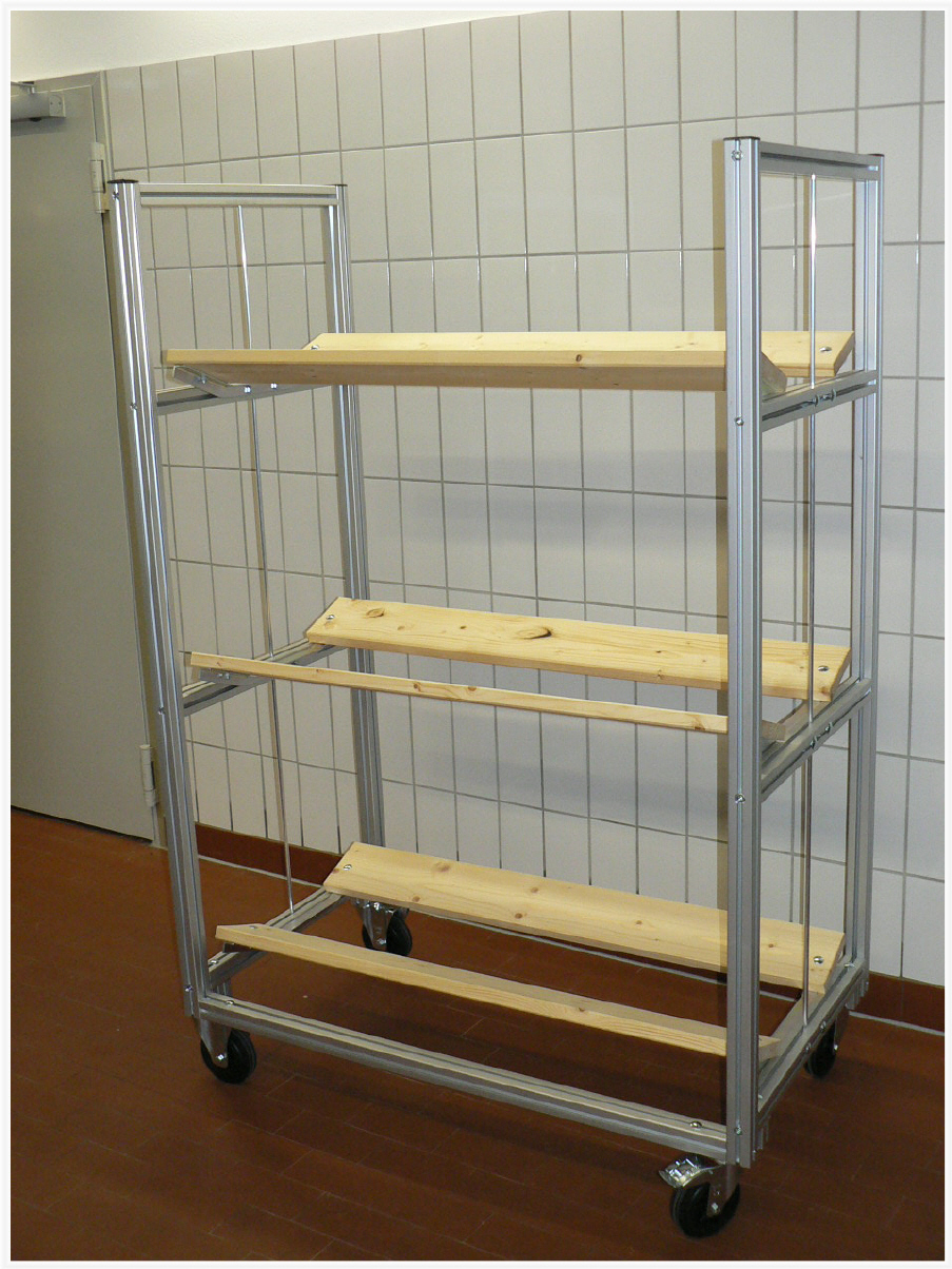 Schlauchregalwagen aus eloxiertem Aluminium.