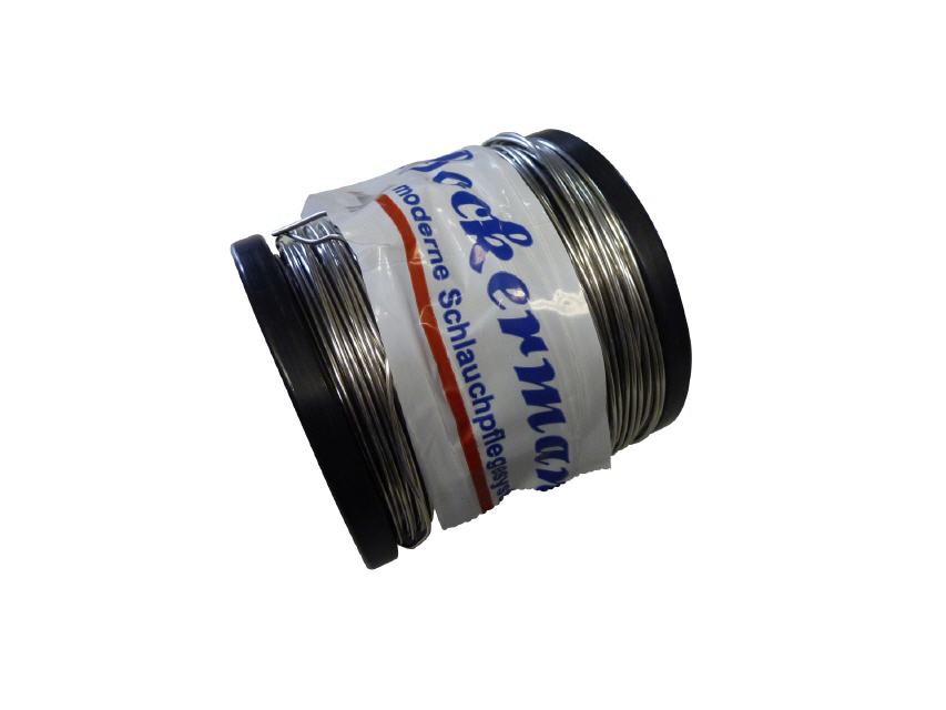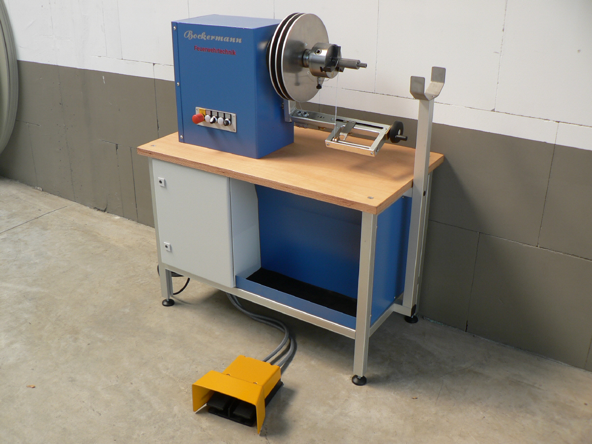 Schlaucheinbindemaschine zum Einbinden von Saug -, und Druckschläuchen der Größen D, C, B und A. Von Drehscheiben, auf denen der Einbindedraht aufgespult ist, wird der Draht über einen Spannarm mit Spann -, und Führungseinrichtung gleichmäßig stramm um den Schlauch gewickelt. Das feststehende Dreibackenfutter verhindert dabei das Drehen der Schläuche. Zum Einbinden von Saugschläuchen ist eine Schlauchstütze an der Tischplatte angebracht. Die elektrische Steuerung ist in einem Schaltschrank unterhalb der Tischplatte angebracht. Die Drehung des Spannarmes sowie der Drehscheiben mit dem Einbindedraht erfolgt über einen Doppelfußschalter für stufenlose Drehzahlregelung. Eine Not-Aus-Einrichtung sowie eine Sicherheitsrutschkupplung erfüllen die Anforderungen der UVV.