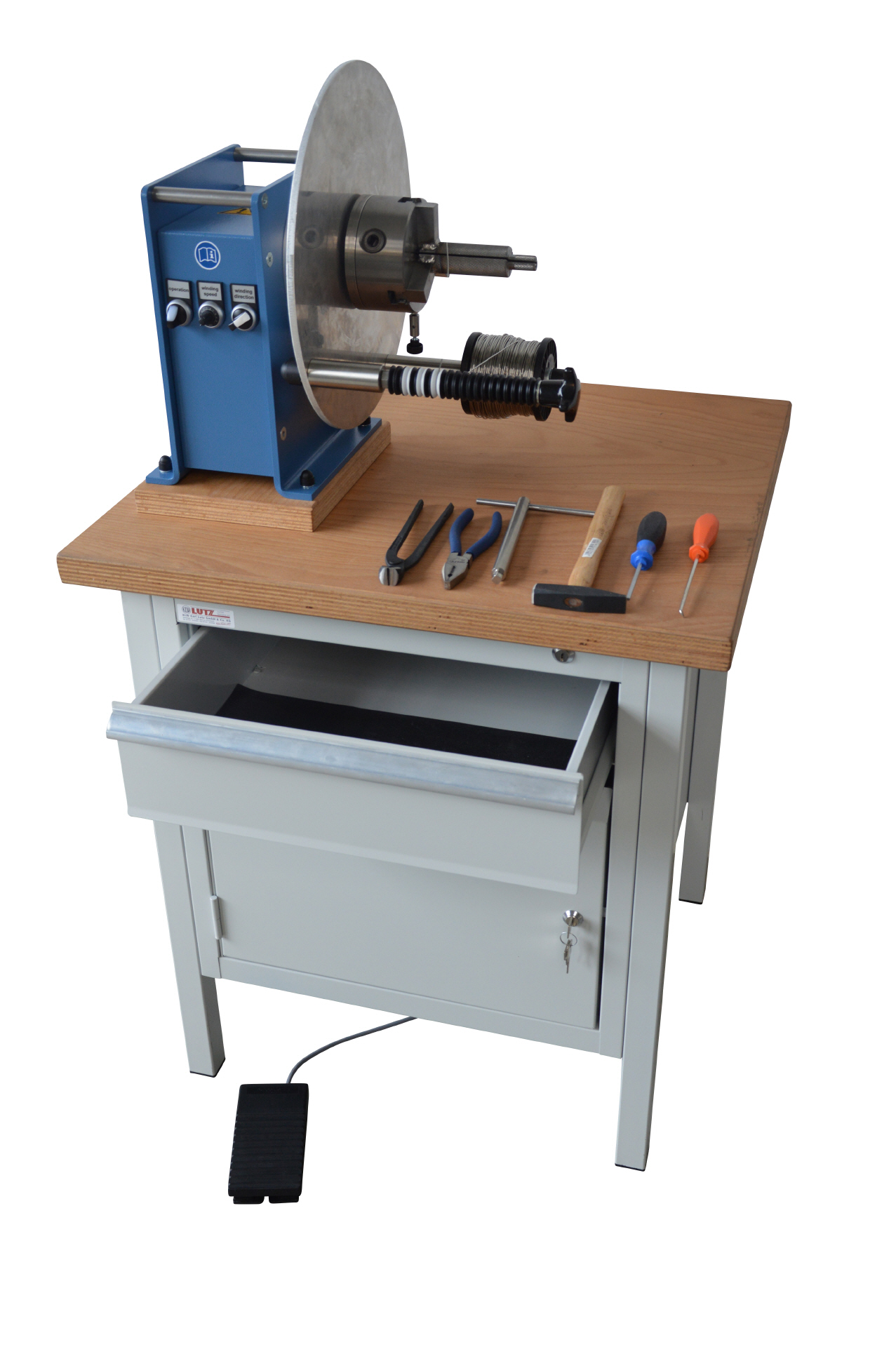 - Drehscheibe aus Aluminium mit Drahtspule und Drahtklemmvorrichtung